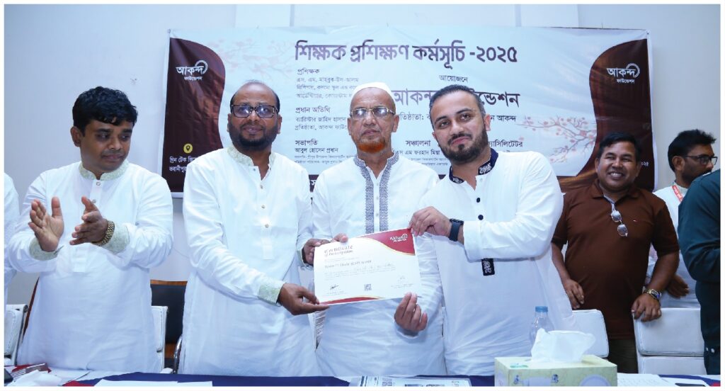 শিক্ষকরা সমাজ গঠনের মূল কারিগর। একজন দক্ষ শিক্ষক শিক্ষার্থীর জীবনে যে প্রভাব ফেলতে পারেন, তা পুরো জাতির অগ্রযাত্রায় প্রতিফলিত হয়। আকন্দ ফাউন্ডেশন তাই ২০২৫ সালে একটি বিশেষ শিক্ষক প্রশিক্ষণ কর্মসূচির আয়োজন করে। এই প্রশিক্ষণে বিভিন্ন শিক্ষা প্রতিষ্ঠানের শিক্ষকরা অংশগ্রহণ করেন। প্রশিক্ষণে তাদের আধুনিক পাঠদান পদ্ধতি, তথ্যপ্রযুক্তি ব্যবহারের দক্ষতা, শিক্ষার্থীদের মানসিক স্বাস্থ্য সম্পর্কে সচেতনতা এবং সৃজনশীল শিক্ষণ পদ্ধতি সম্পর্কে দিকনির্দেশনা দেওয়া হয়।